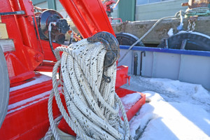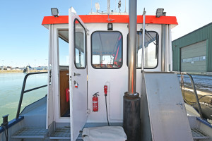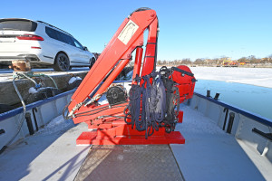 On the aft deck there is an HMF HYFA crane with a lifting capacity of 665 kg at 6 m outreach, towing hook, and a cargo hold or storage space below deck.