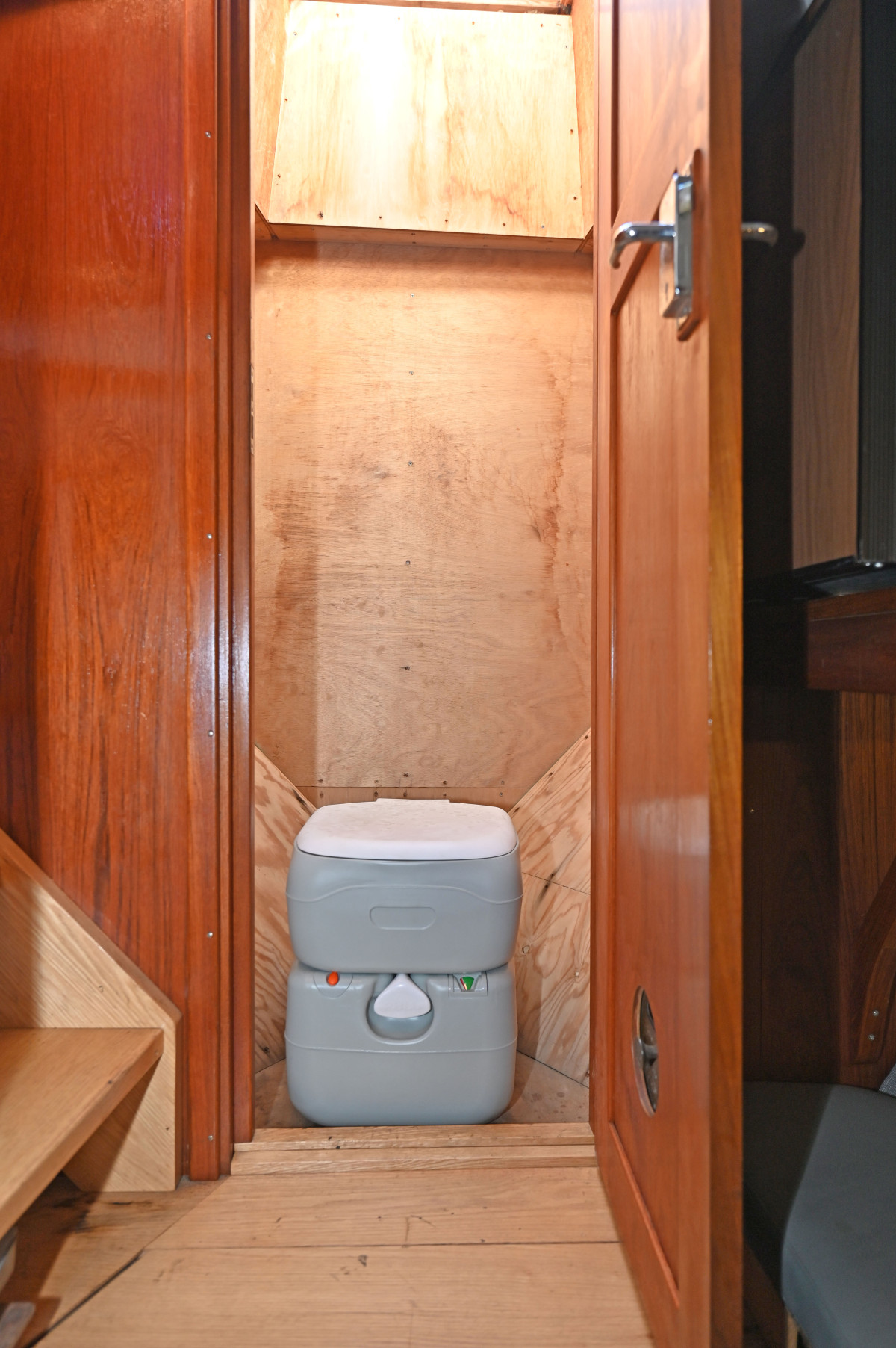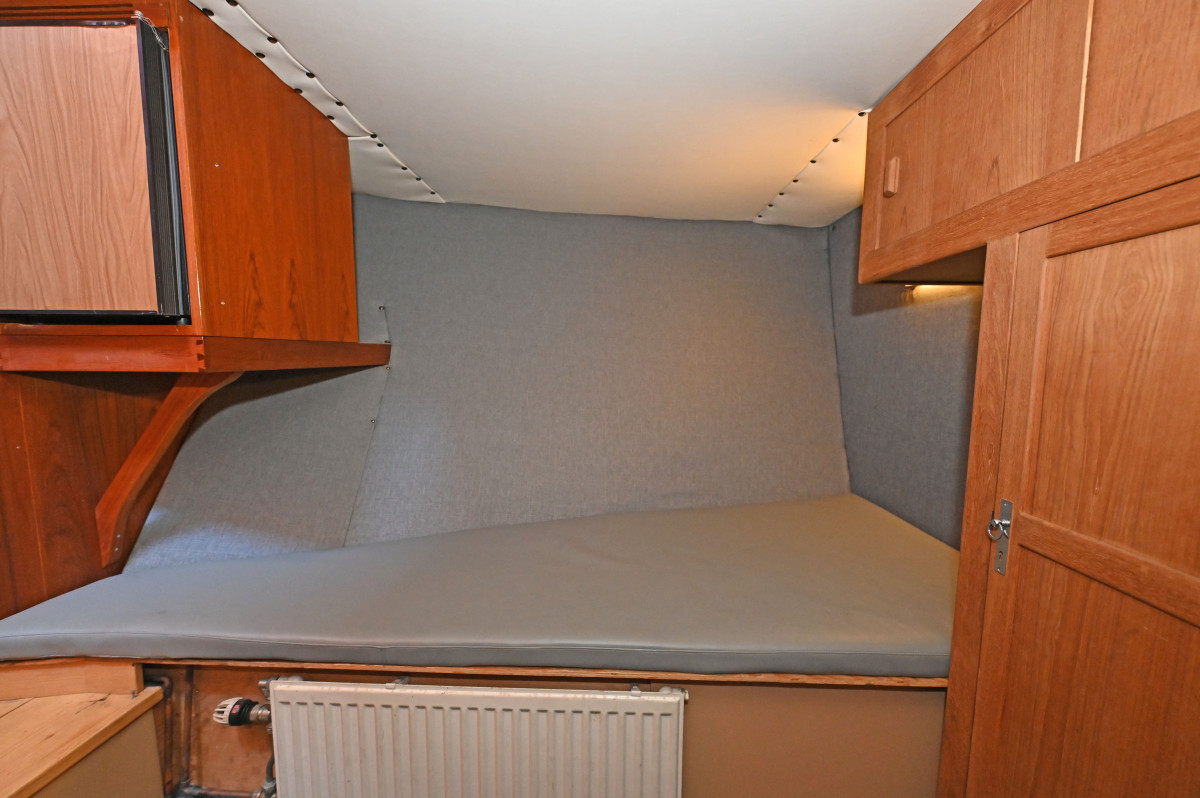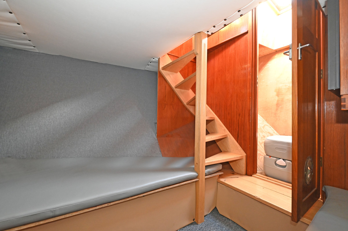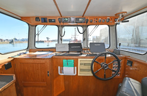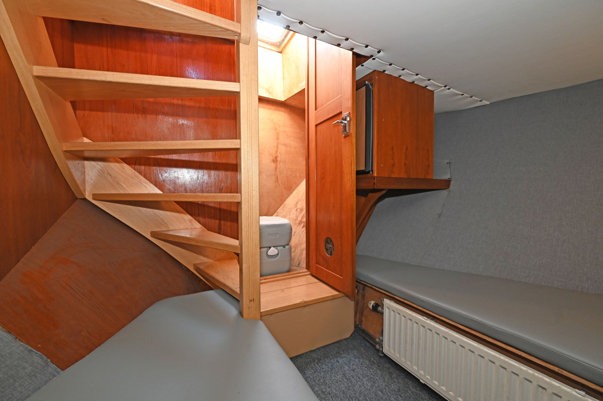 Modern navigation equipment. The wheelhouse is fitted with two seats, a small sofa with table, and a compact galley. Below deck there is one cabin with two berths and a toilet.