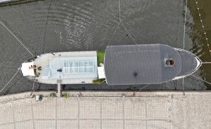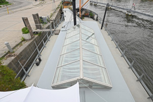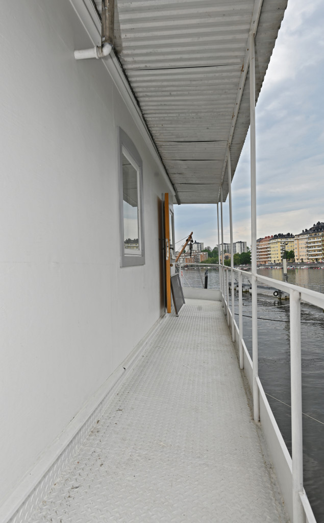 Övre däck med uteplats i aktern. Den, från kajen, insynsskyddade uteplatsen är under tak och har även en eldstad.