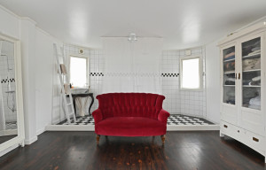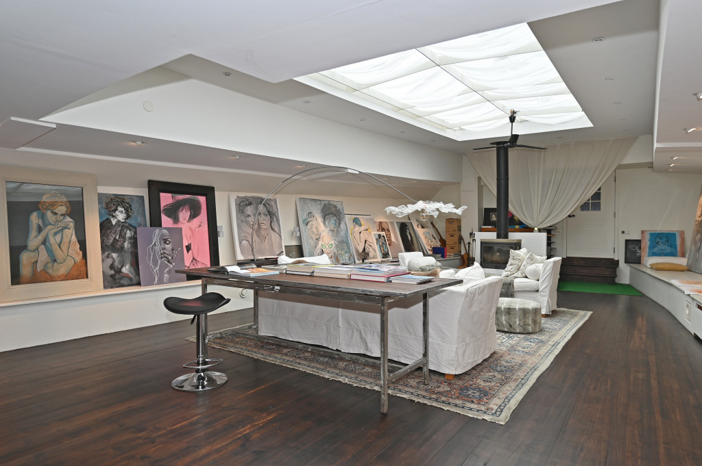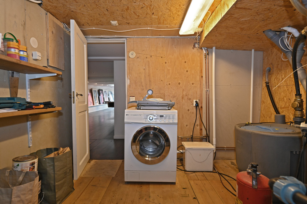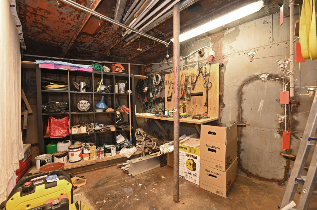 Från en spiraltrappa från salongen på huvuddäck eller direkt från utsidan kommer man ner i den stora galleridelen på drygt 100 kvm. Här finns en gästtoalett och en vedkamin. Från det stora takfönstret om ca 3 x 6 meter flödar det naturliga ljuset ner.