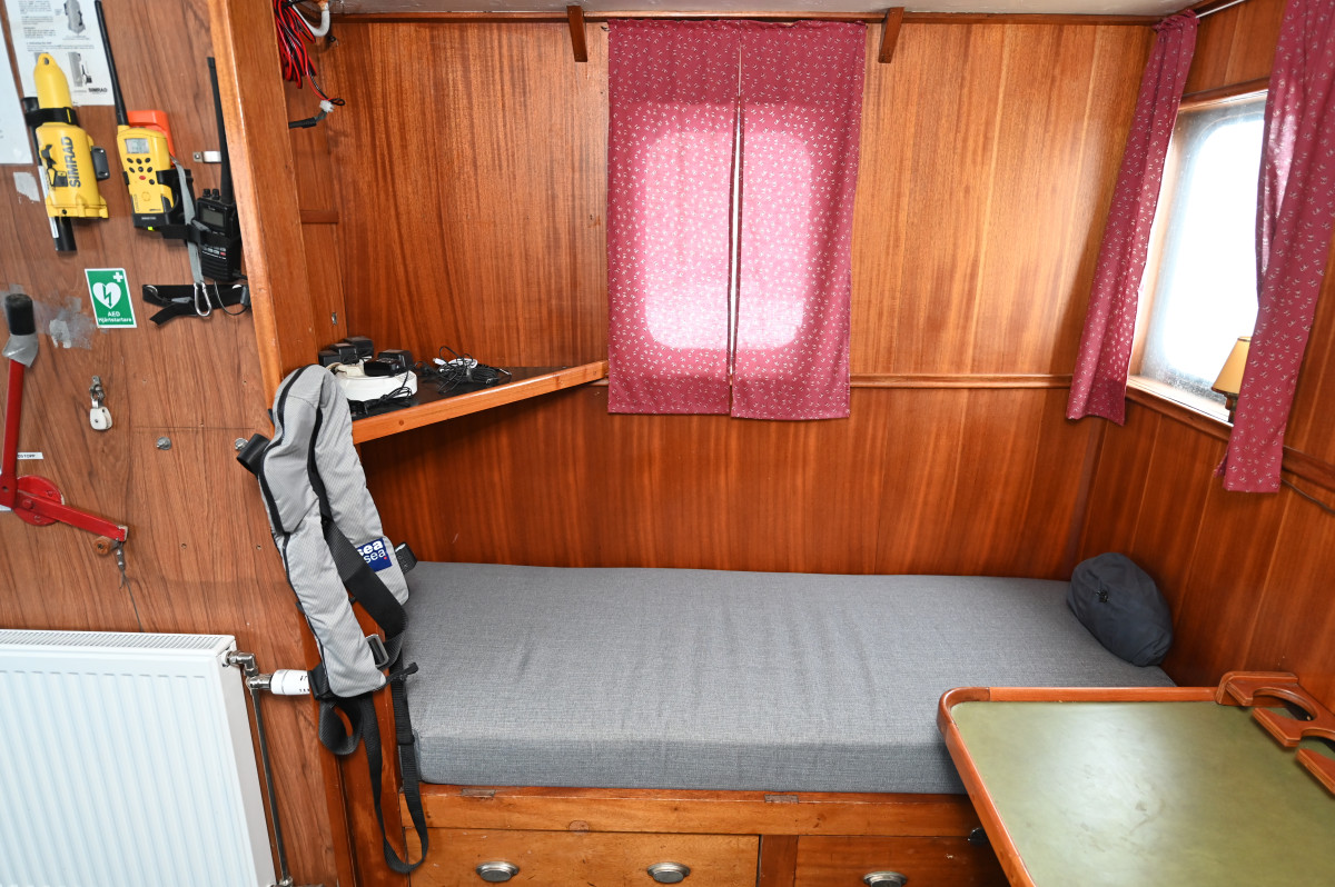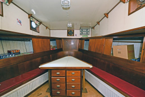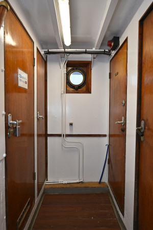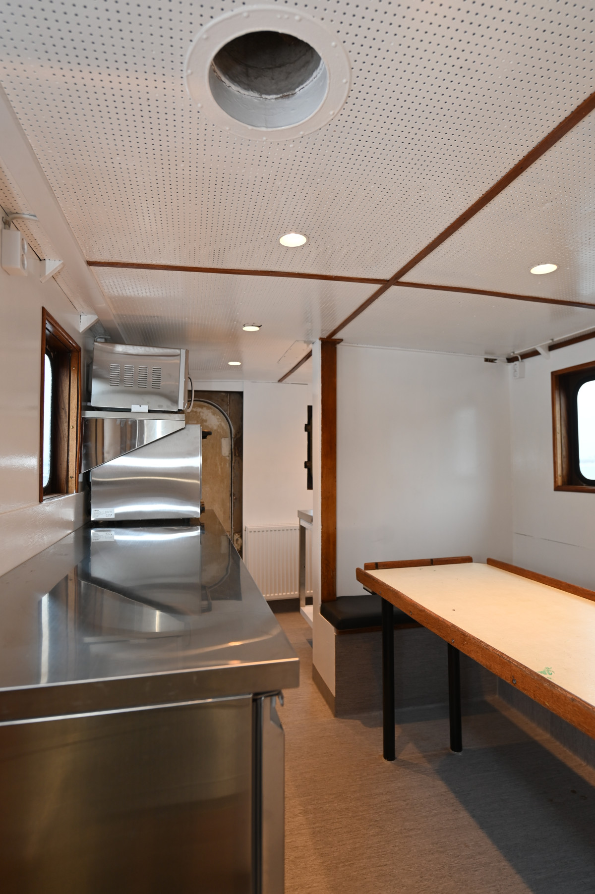 Salong under däck med fyra nybyggda dubbelbäddshytter. Toalett/dusch ovanför lejdaren ner till salong.